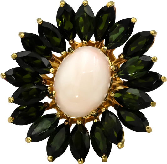 18k Yellow Gold Coral & Green Tourmaline Flower Ring 19.70CTW Size 9