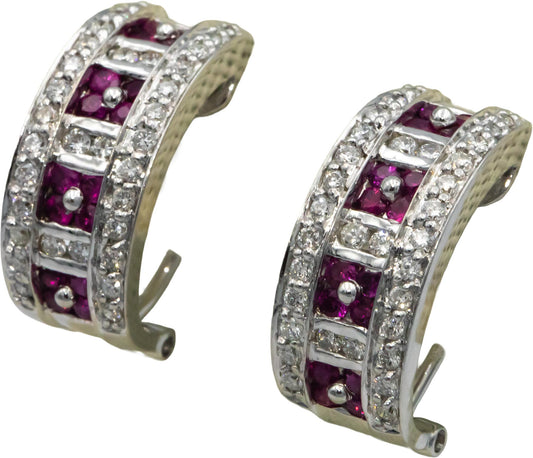 18k White Gold Round Diamond and Ruby Curved Earrings 1.50CT