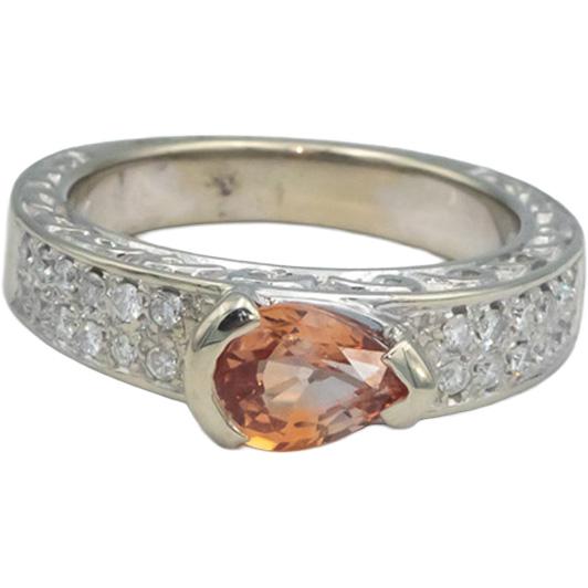 14k White Gold Diamond and GIA Cert Orange Sapphire Ring w/ Carved Sides 1.75CT