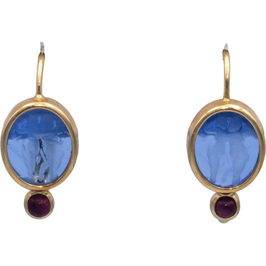 14K Yellow Gold Ruby and Carved Glass Dangle Earrings 0.20CT