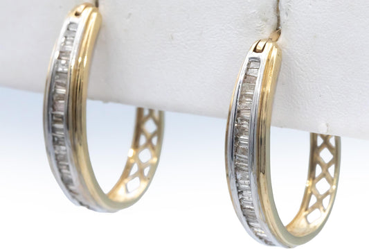 10k Yellow & White Gold Jewelry Baguette Cut Diamond Hoop Earrings 1.01CT