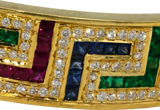 Diamond Ruby Emerald Sapphire 18k Yellow Gold Hinged Bangle Bracelet 3.70CT