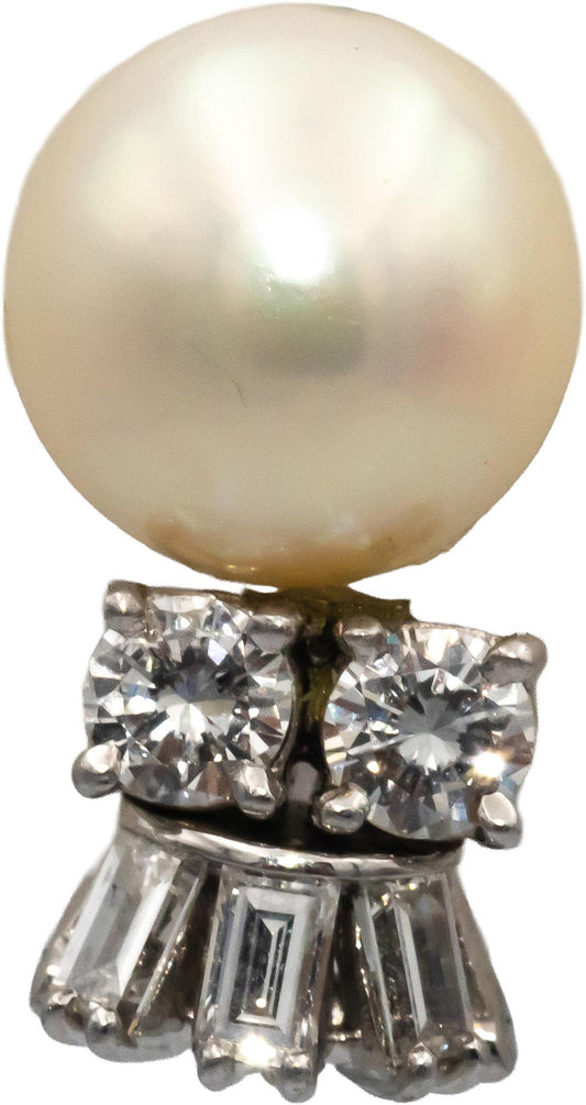 14k White Gold VS Round & Baguette Diamond 9.5mm Pearl Stud Earrings 1.0CT