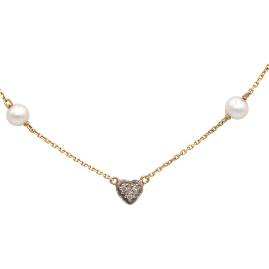 14k Yellow Gold Round Diamond and Pearl Chain Necklace 0.03CT