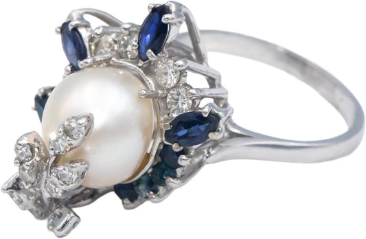 14k White Gold 1.50CT Diamond Sapphire and 10mm Pearl Cocktail Ring Size 8.25