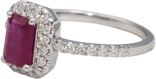 18k White Gold Emerald Cut Ruby Round Diamond Cocktail Ring 1.45CT Size 7