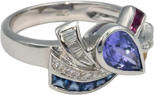 18k White Gold Diamond Tanzanite Sapphire Ruby Ribbon Ring 1.40CT Size 7