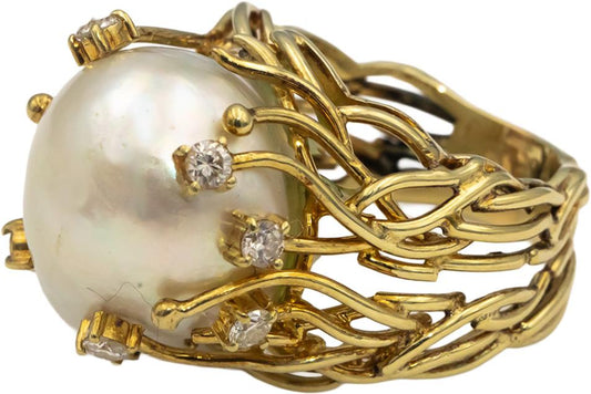14k Yellow Gold VS Round Diamond & 16mm Pearl Cocktail Ring 0.50CT Size 7.5