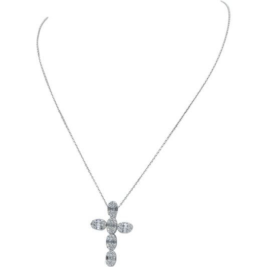 18k White Gold 1.0CT VS Baguette & Round Diamond Cross Crucifix Pendant Necklace