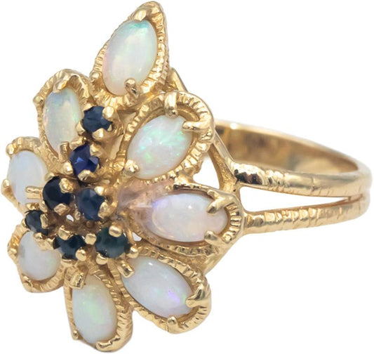 14k Yellow Gold 1.50CT Opal and Blue Sapphire Floral Cocktail Ring Size 6